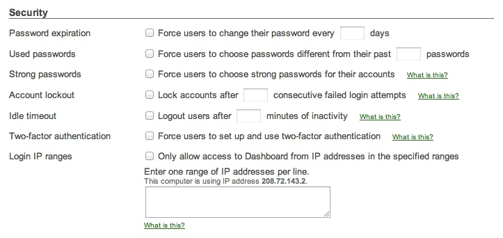 - Account security protections (strong passwords, maximum number of failed attempts, IP based login restrictions, etc.)